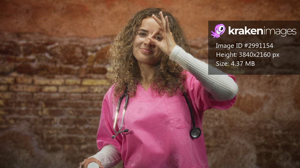 Woman doctor in pink uniform with stethoscope holding pill bottle and making ok sign with hand in studio; cheerful care.