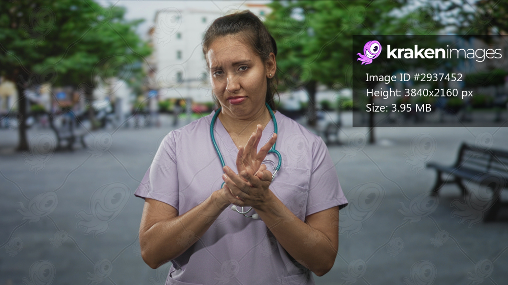 Woman doctor in scrubs rubbing hands and checking palms on city street with stethoscope visible; compassion fatigue.