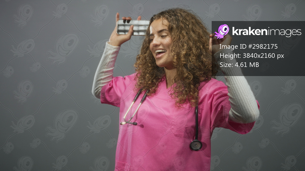 Woman doctor in studio holds phone to ear and raises hand while smiling in pink scrubs with stethoscope visible; joy celebration.