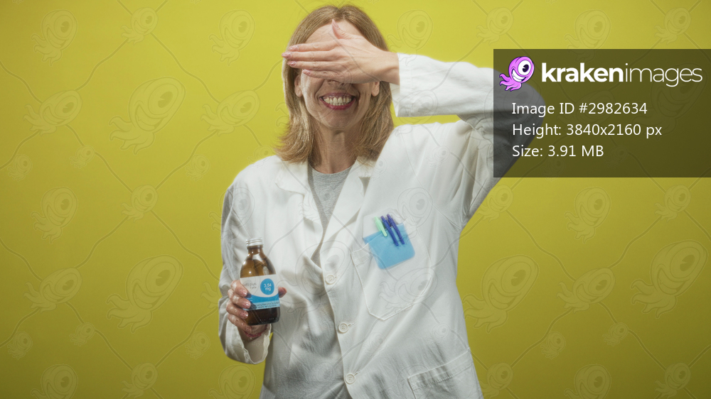 Woman doctor in studio wearing lab coat covers eyes with hand while holding a syrup bottle and smiling; playful reassurance.