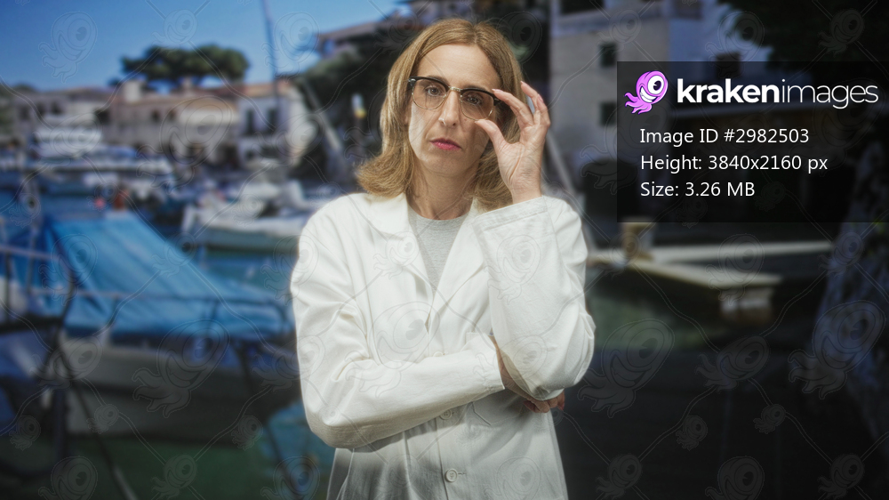 Woman doctor in white coat adjusts glasses with hand, arms crossed at marina pier; pensive reflection.