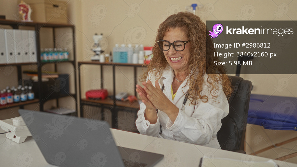 Woman doctor in white coat claps hands at laptop on desk with stethoscope visible in medical building; joy celebration.