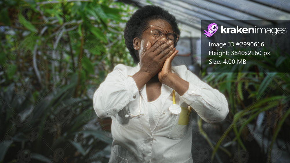 Woman doctor in white coat covers mouth with hands, stethoscope visible, yawning then stretching inside greenhouse; relief recovery.