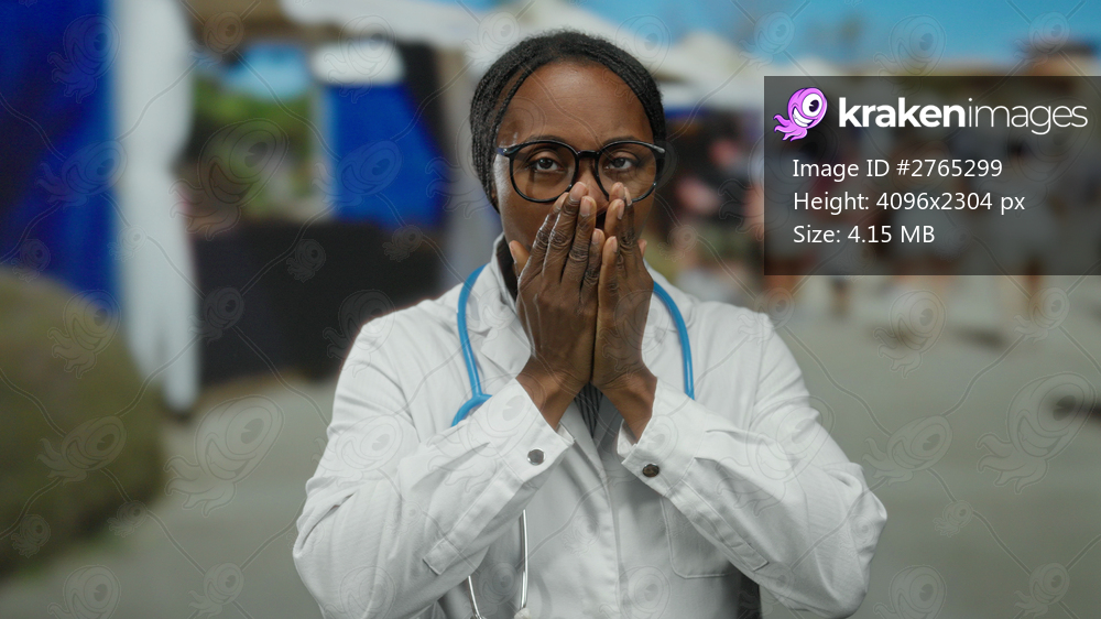 Woman doctor in white coat and glasses standing outdoors on urban street with blurred crowd and buildings in background, looking cold and thoughtful.