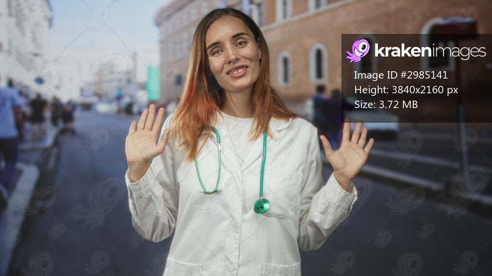Woman doctor in white coat with green stethoscope raises hands palms forward smiling in a city street; approachable optimism.