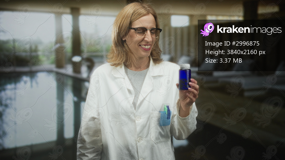 Woman doctor in white coat holding a blue medicine bottle, hand raised showing pills, smiling and wearing glasses in a poolside building with loungers; trust wellness. - Kraken Images