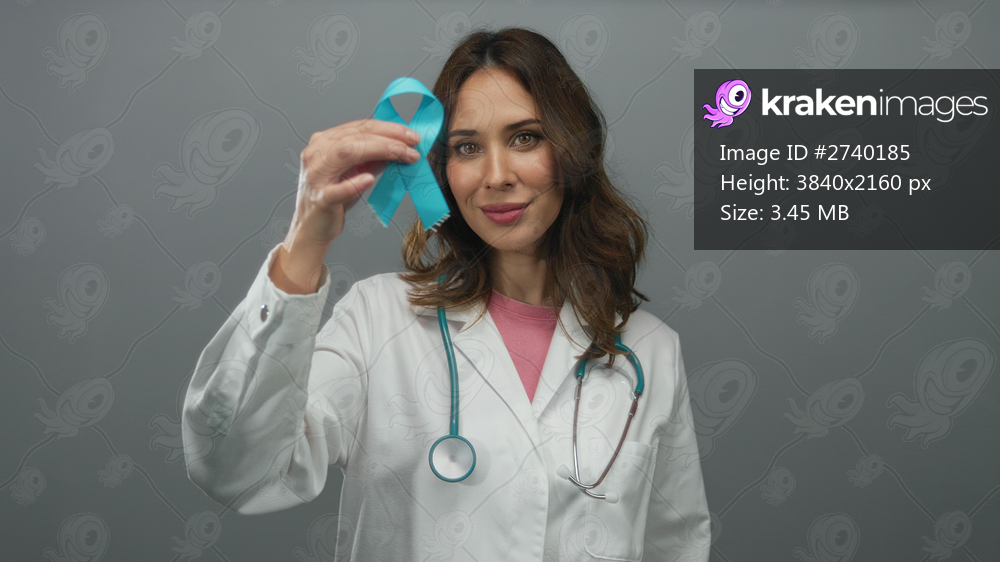 Woman doctor in white coat holding blue ribbon with stethoscope over grey background, symbolizing support and awareness in healthcare environment.