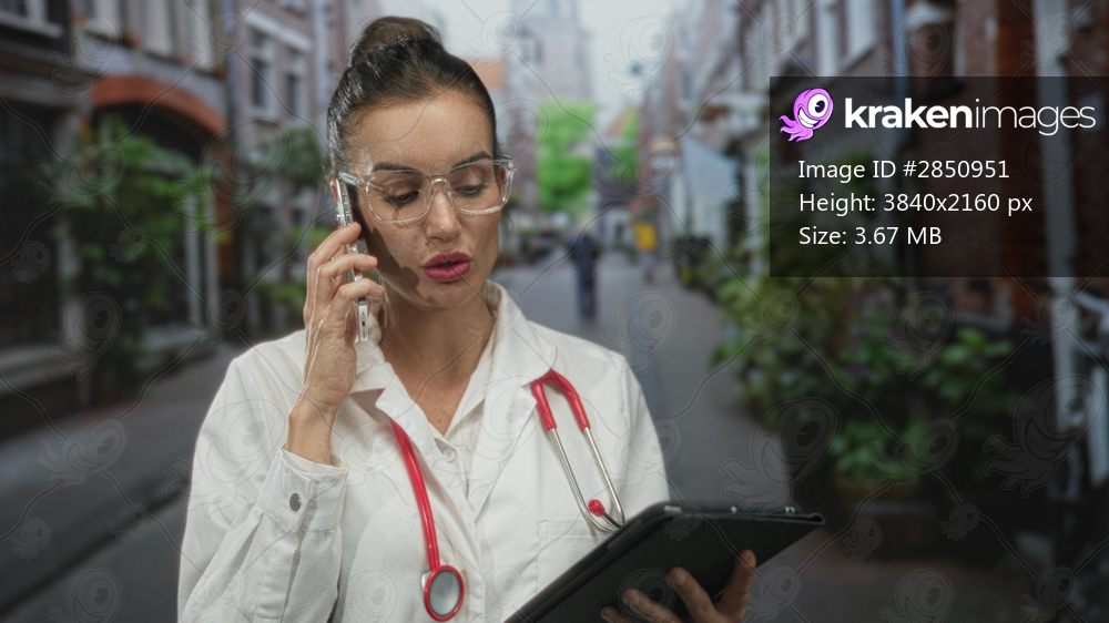 Woman doctor in white coat holding phone to ear and tablet with stethoscope on street; dedication care.