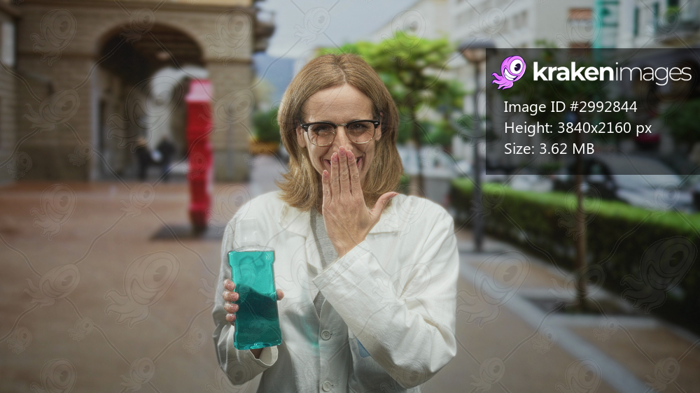 Woman doctor in white coat holding turquoise mouthwash bottle, hand covering mouth while smiling on a city street near building facades; surprise hygiene. - Kraken Images