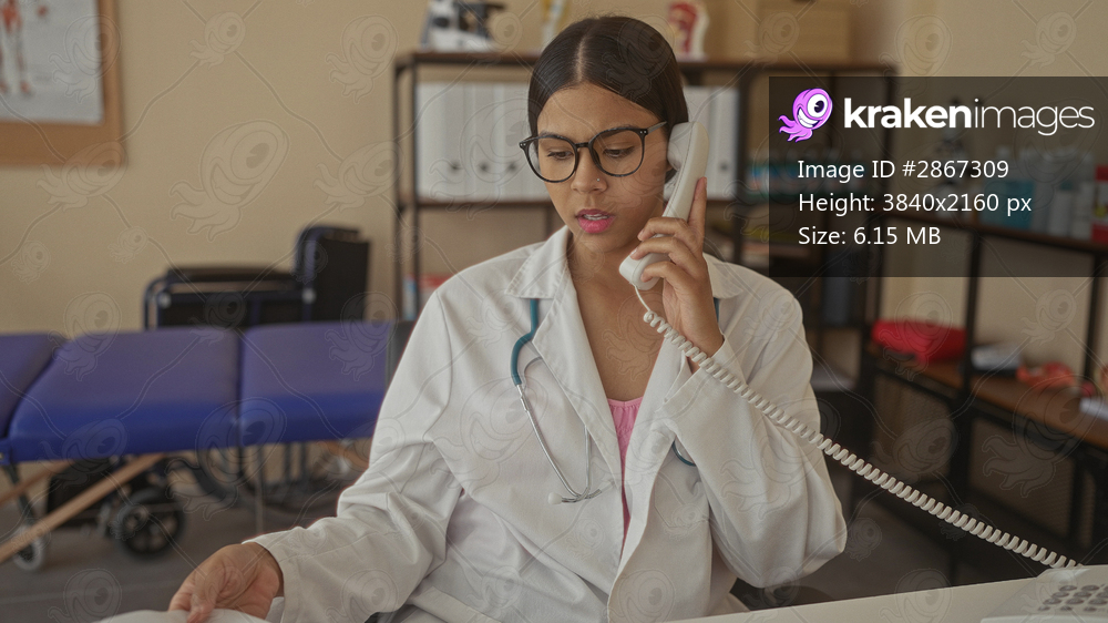 Woman doctor in white coat holds phone to ear with hand while reading a medical report at a clinic desk; concern.