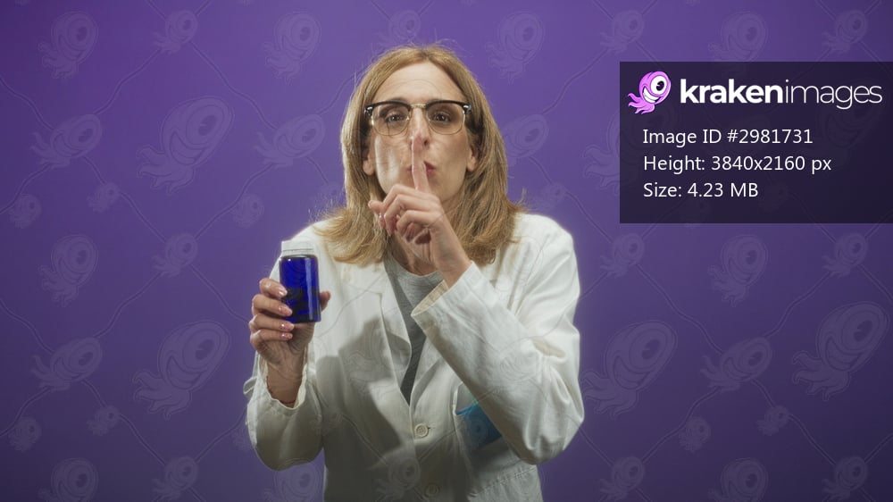 Woman doctor in white coat holds pill bottle and puts finger to lips for silence in studio; secrecy trust.