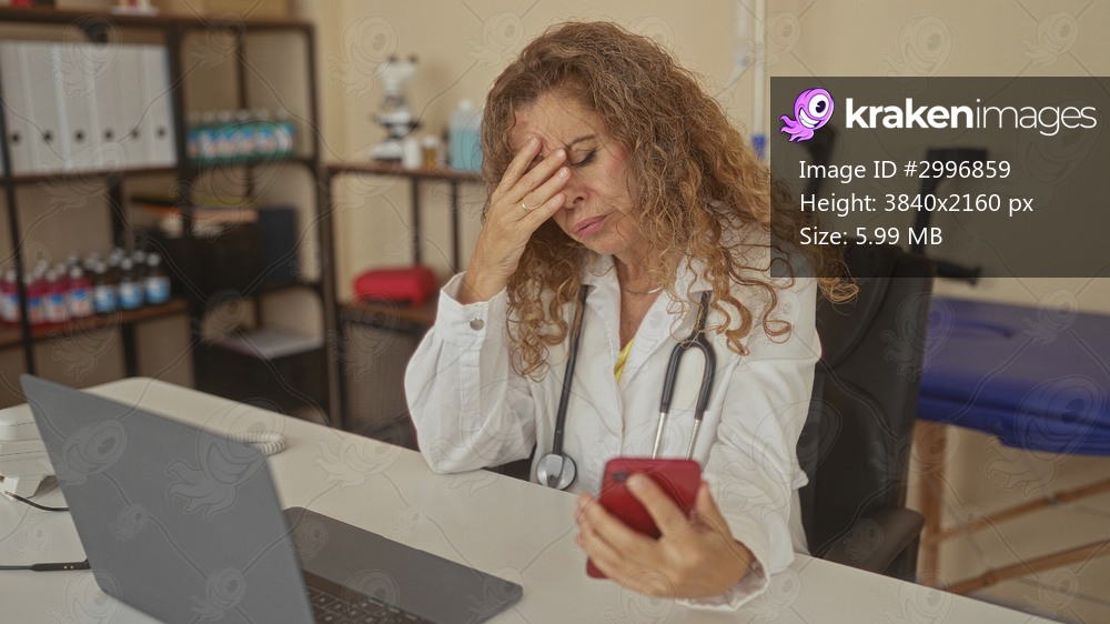 Woman doctor in white coat holds red smartphone, lifts glasses and rubs her forehead while seated at a desk with laptop in clinic building; fatigue.