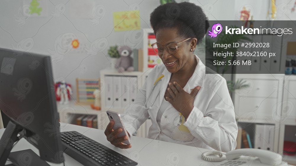 Woman doctor in white coat holds smartphone with one hand, hand on chest and smiling at screen in building; compassion and care.