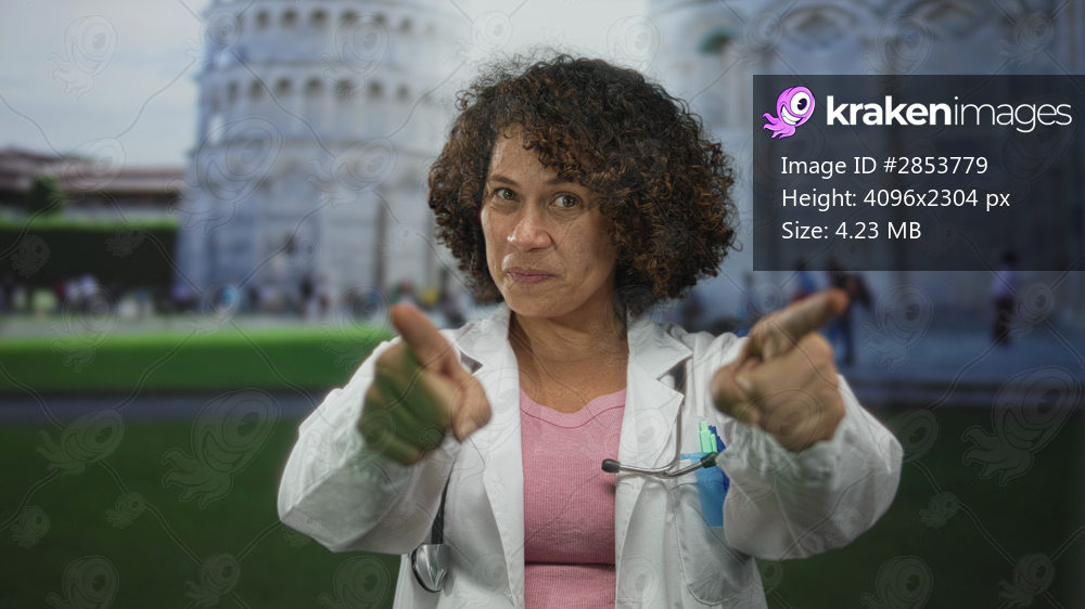 Woman doctor in white coat holds stethoscope and points finger at camera in front of pisa tower outdoors on grass lawn; confidence.