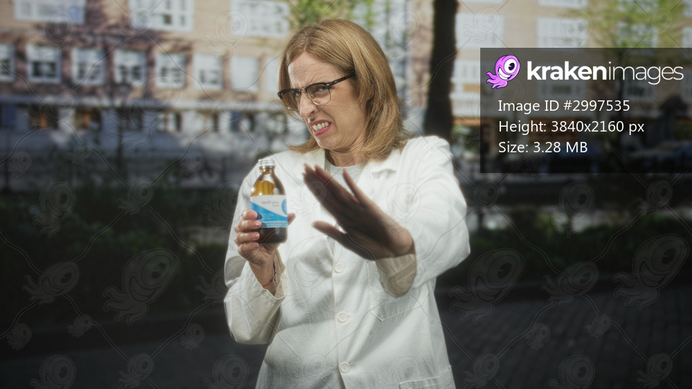 Woman doctor in white coat holds syrup bottle and recoils with palm out on a street; disgust refusal caution.