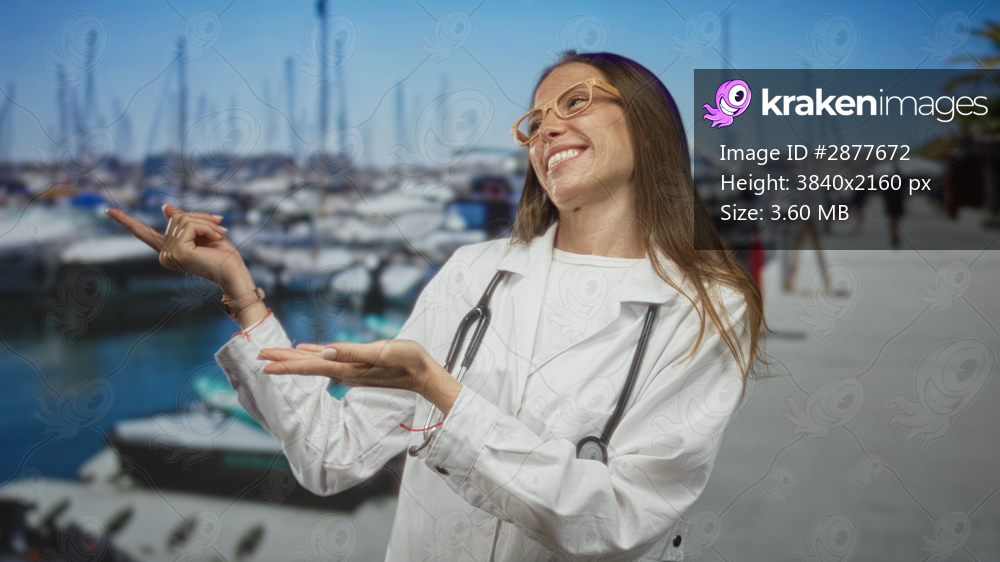 Woman doctor in white coat pointing with hands toward boats at sunlit marina pier; community wellness joy.