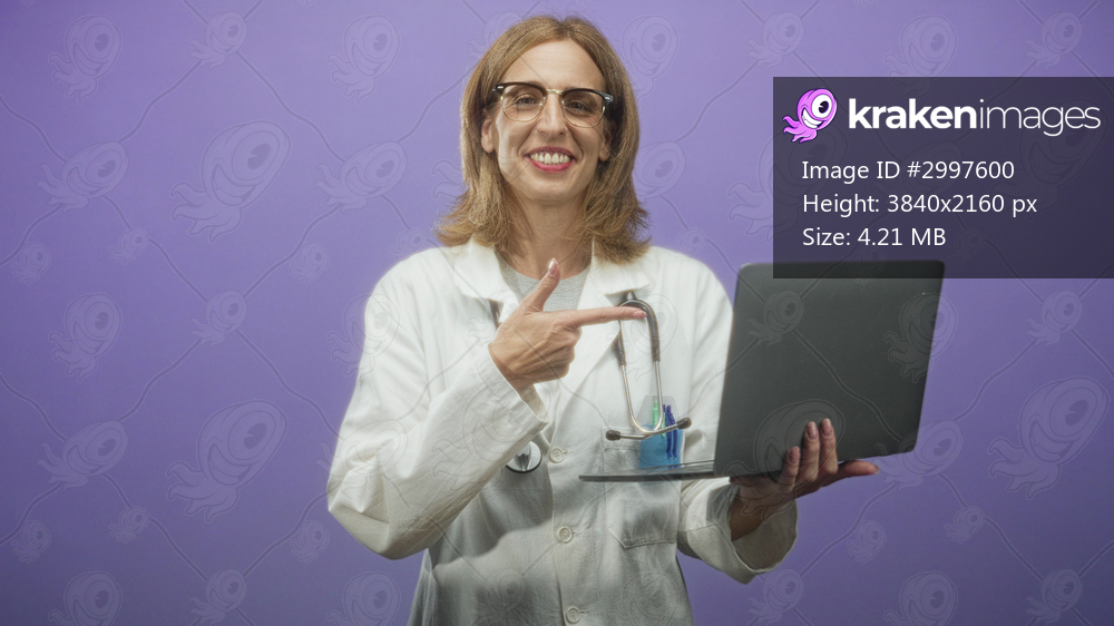 Woman doctor in white coat points finger to laptop while holding it and shows stethoscope in studio; compassion confidence.