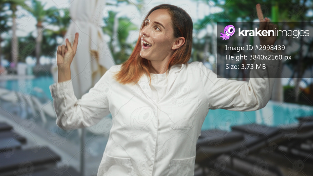 Woman doctor in white coat points index fingers up at a resort pool with lounge chairs and palm trees, smiling and eyes closed; playful confidence.