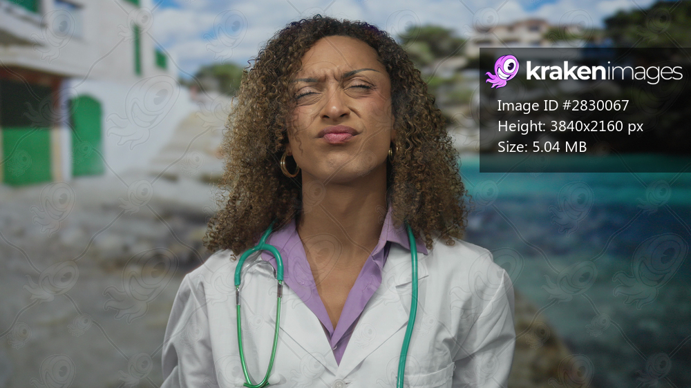 Woman doctor in white coat and purple shirt with stethoscope pointing finger to head at building entrance; thinking concern.