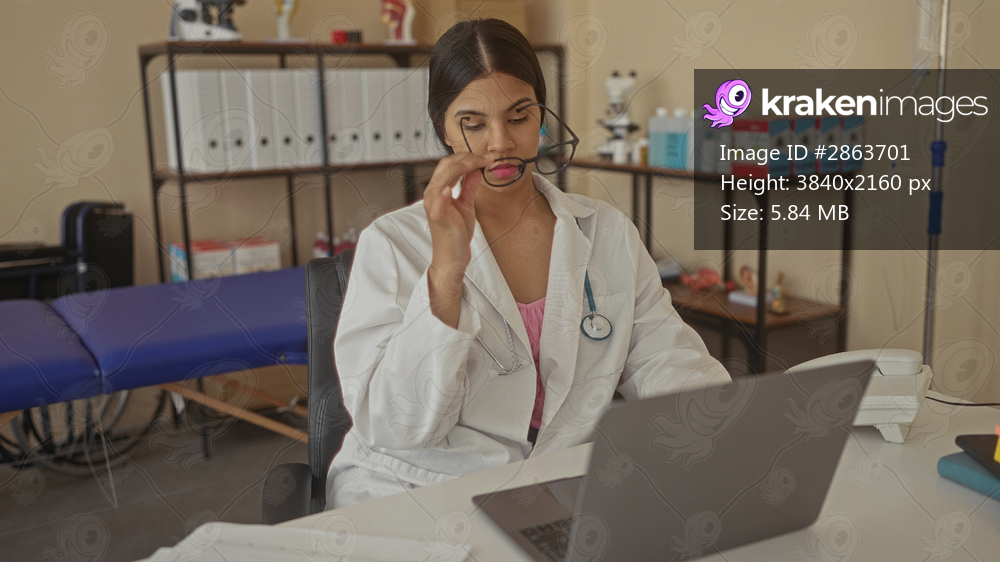 Woman doctor in white coat removes glasses while using laptop at desk in building; focus concentration.