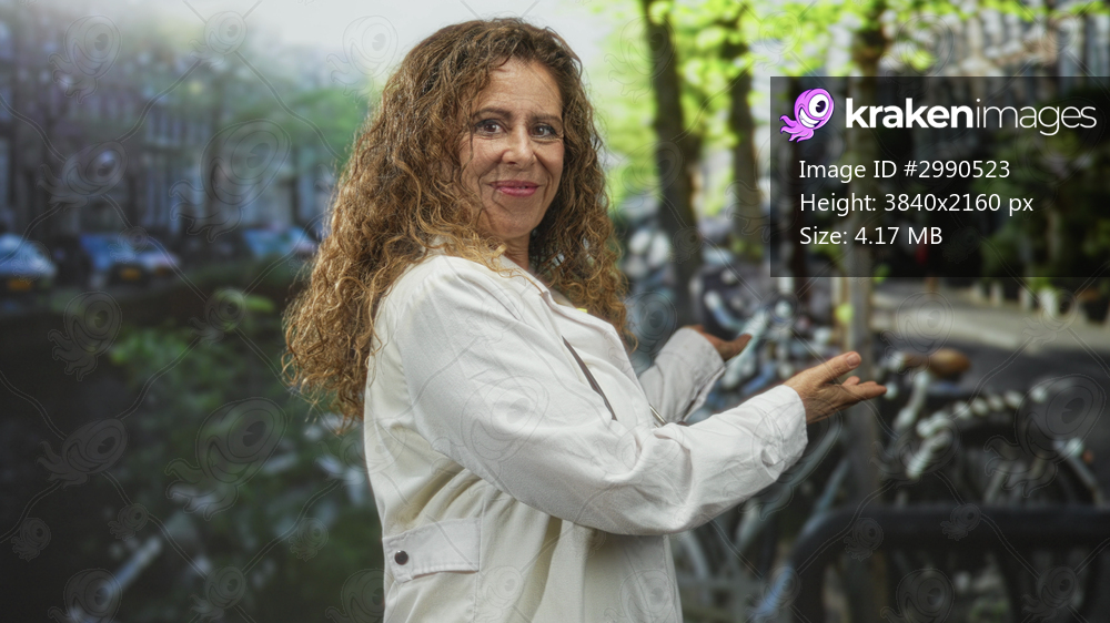 Woman doctor in white coat smiles with open palms toward bicycles and tree lined city street, engaging in a friendly talk; serenity reflection.