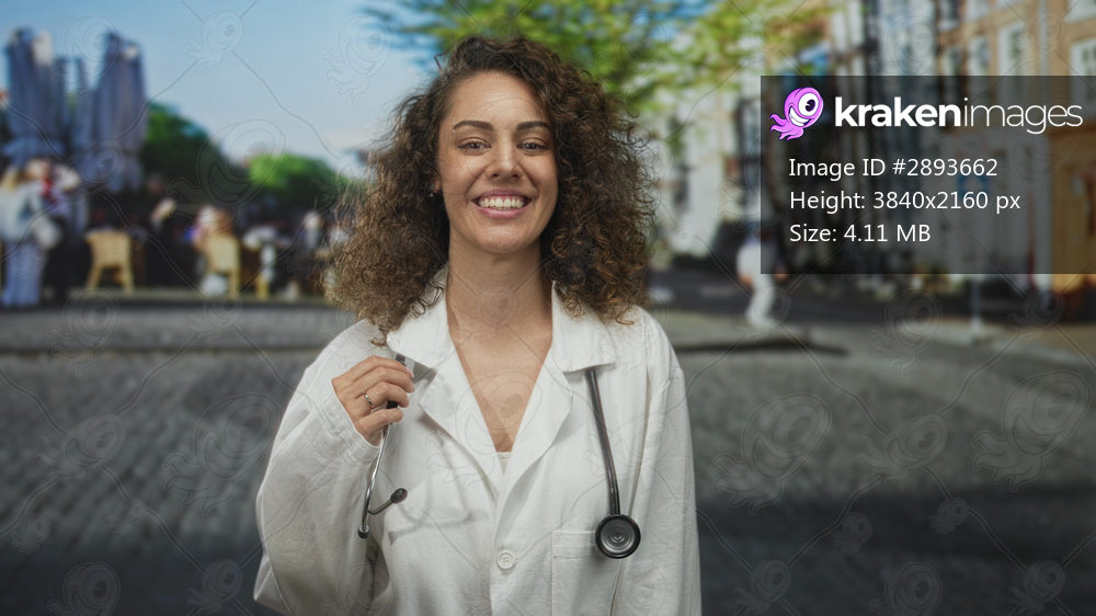 Woman doctor in white coat smiling while holding a stethoscope on a cobblestone city street with blurred cafe and buildings; compassion trust care.