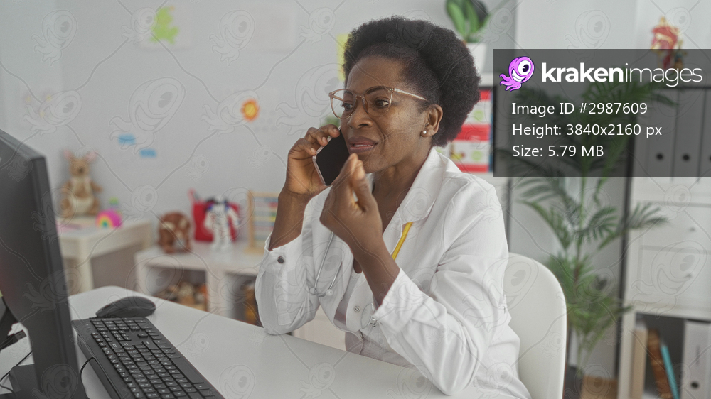 Woman doctor in white coat speaking on phone and gesturing with hand at desk in medical building with computer monitor and stethoscope visible; concerned care. - Kraken Images