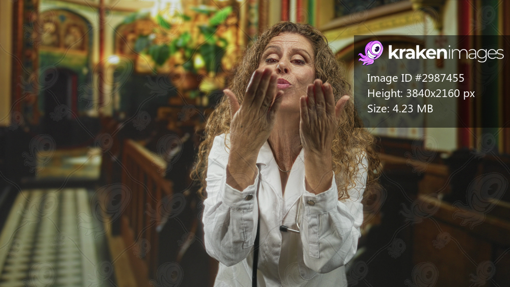 Woman doctor in white coat with stethoscope blows a kiss with hand inside ornate building; affection gratitude.