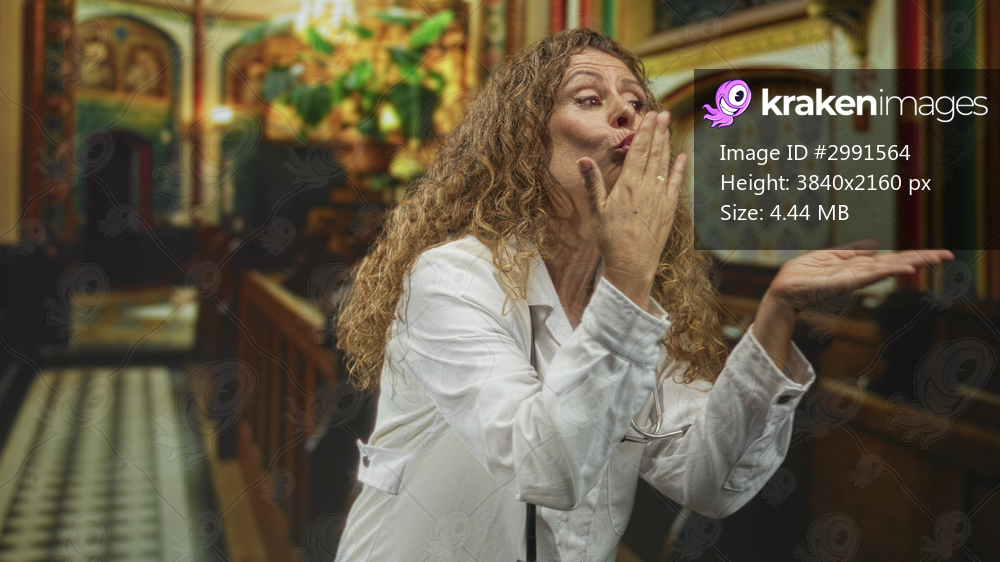 Woman doctor in white coat with stethoscope blows a kiss with hand inside ornate building; affection gratitude.