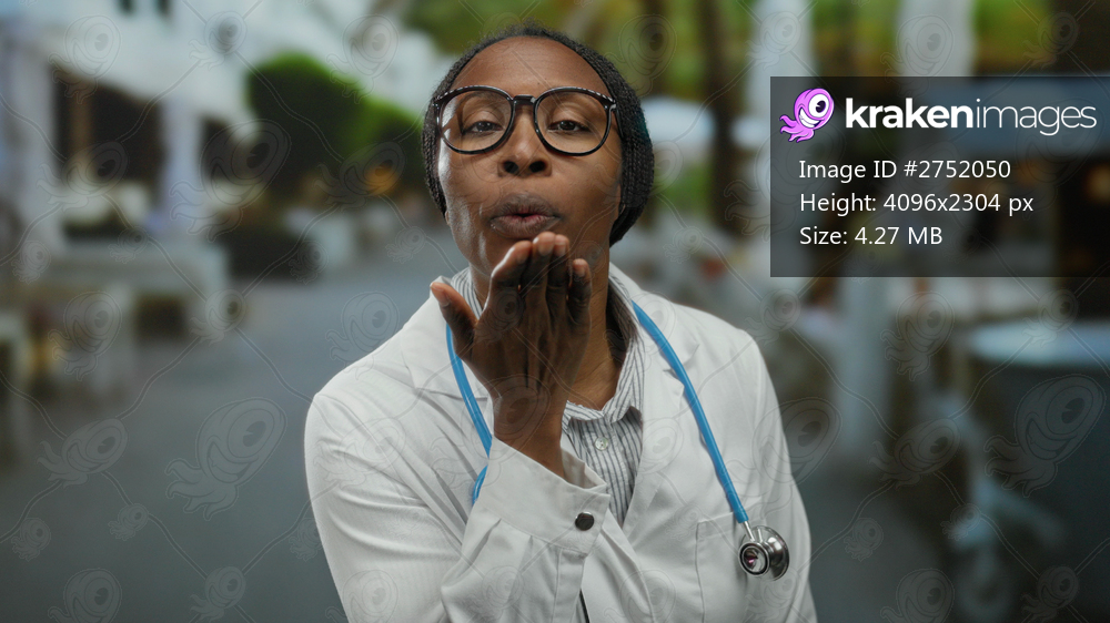 Woman doctor in white coat and stethoscope blows kiss on urban street with defocused city background showcasing professional healthcare in outdoor setting. - Kraken Images