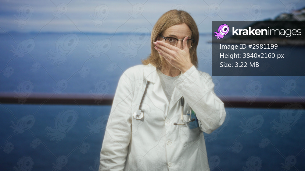 Woman doctor in white coat with stethoscope covers mouth with hand on balcony railing in building sea view; concern empathy.