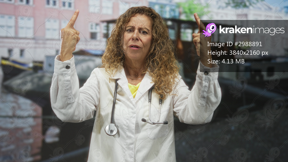Woman doctor in white coat with stethoscope flips both middle fingers at camera in front of building by a canal with boats; defiance protest.