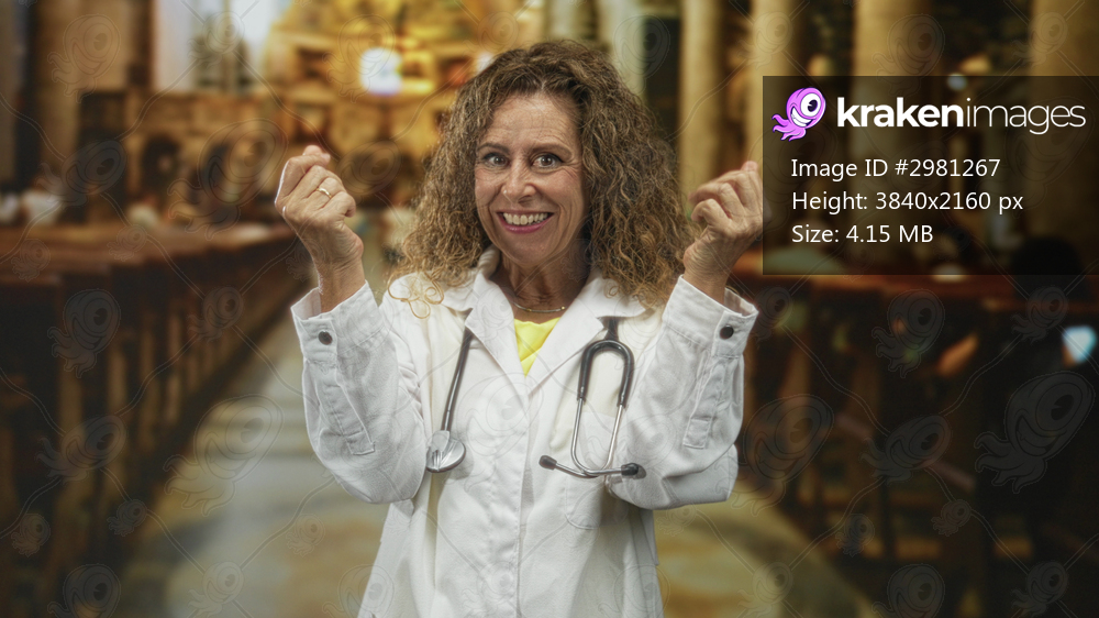 Woman doctor in white coat with stethoscope gestures with hands in a church building; healing reassurance.