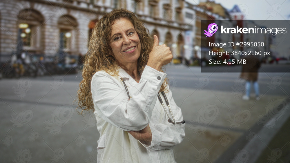 Woman doctor in white coat with stethoscope gives thumb up on street in front of city buildings, smiling and confident; approval trust.