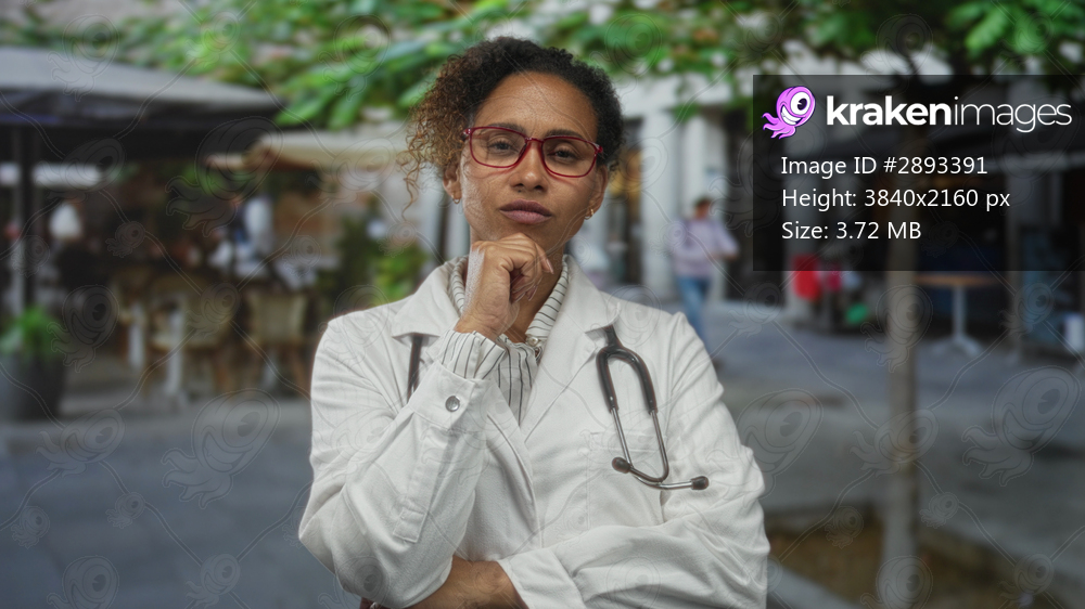 Woman doctor in white coat with stethoscope, hand on chin pensive pose on city street beside cafe and building; thoughtful confidence.
