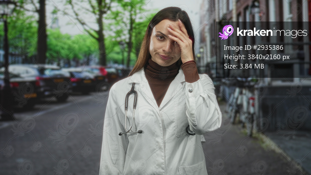 Woman doctor in white coat with stethoscope, hand on forehead while standing on a city street lined with parked cars and bicycles; stress fatigue.
