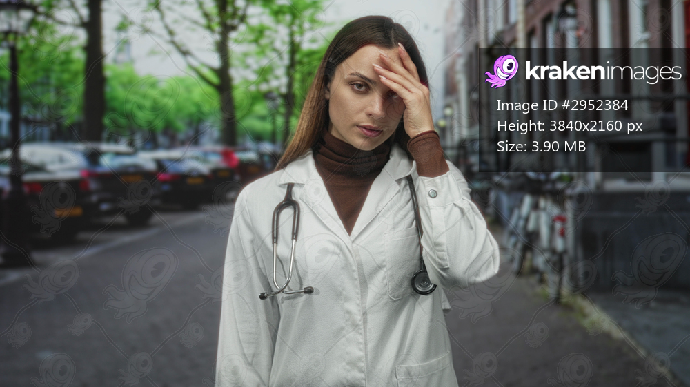 Woman doctor in white coat with stethoscope, hand on forehead while standing on a city street lined with parked cars and bicycles; stress fatigue.