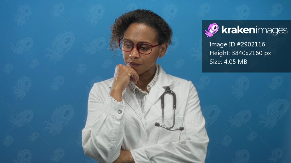 Woman doctor in white coat with stethoscope, hand to chin and thoughtful gaze in blue studio; contemplation.