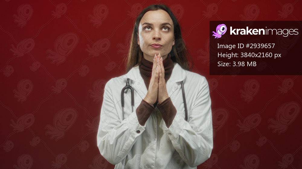 Woman doctor in white coat with stethoscope, hands pressed together in prayer in red studio; compassion calm resilience.