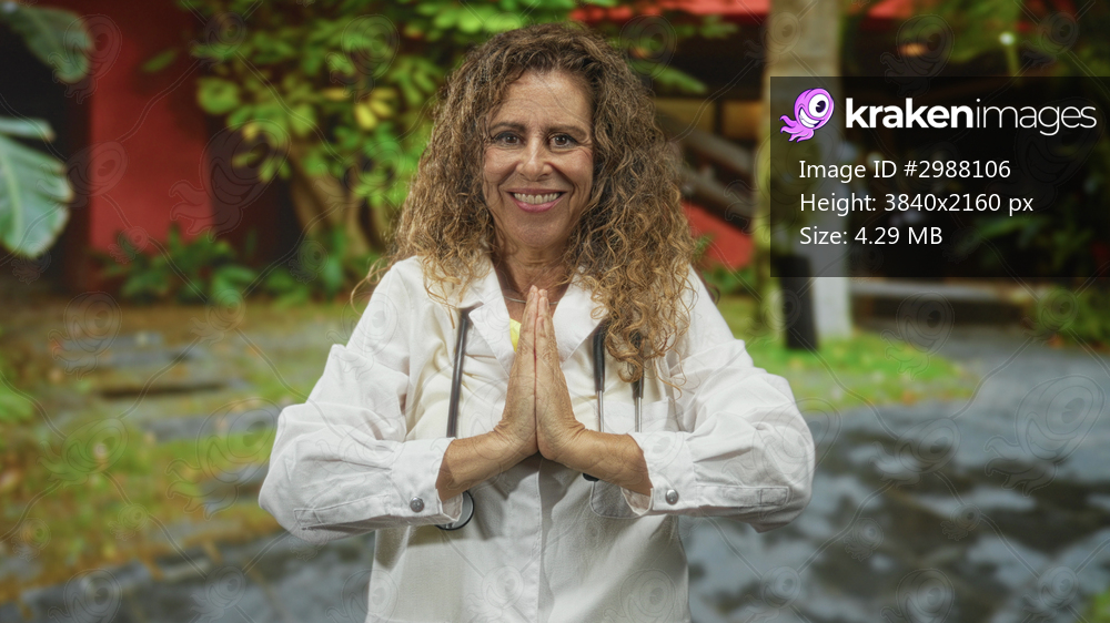 Woman doctor in white coat with stethoscope, hands pressed together prayer gesture and slight smile in clinic courtyard near plants and building entrance; calm compassion. - Kraken Images
