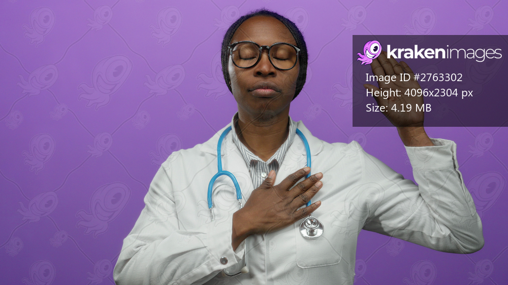 Woman doctor in white coat with stethoscope holding hand to chest against purple background symbolizing oath.