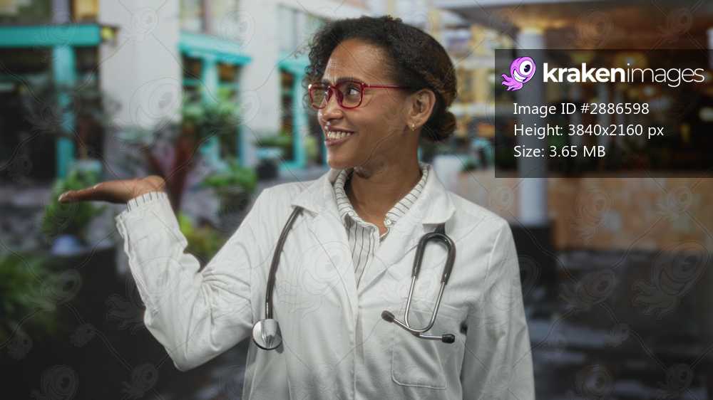 Woman doctor in white coat with stethoscope holding palms up on street with urban plants and columns; compassion wellness trust.