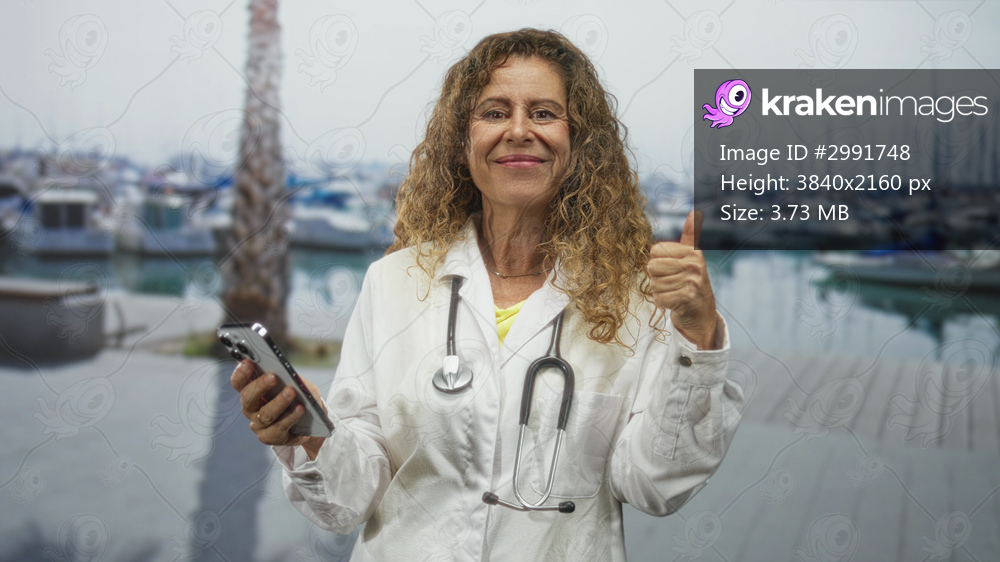 Woman doctor in white coat with stethoscope holding smartphone and giving thumbs up on a street marina dock; confidence reassurance.