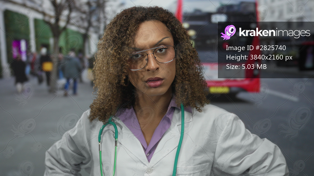 Woman doctor in white coat with stethoscope holds hand palm forward on busy city street; determination.