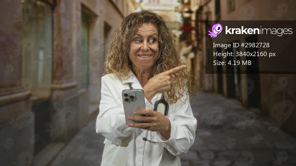Woman doctor in white coat and stethoscope holds smartphone, mouth open and wide eyed while looking at screen on a narrow street; surprise curiosity.