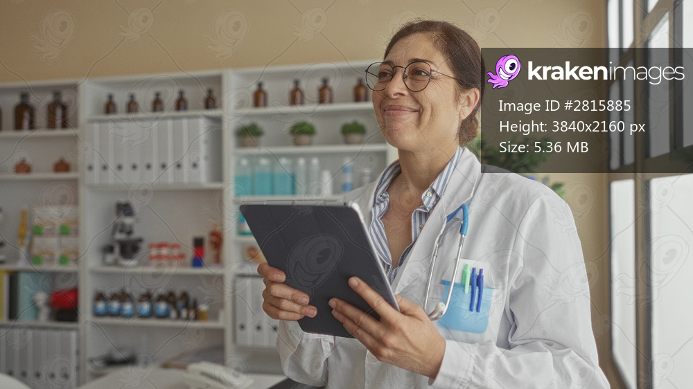 Woman doctor in white coat with stethoscope holds tablet with both hands reading data in clinic consultation room near window; confidence.