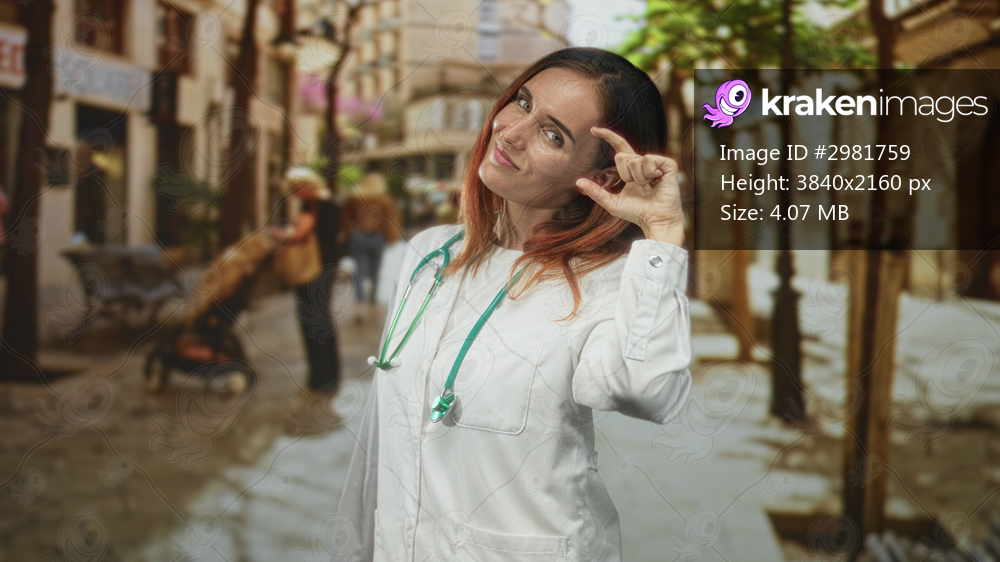 Woman doctor in white coat with stethoscope making a small pinch gesture near face on a street; confidence care.