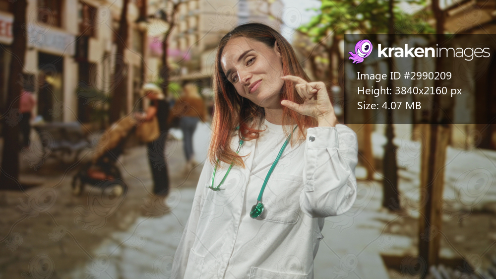 Woman doctor in white coat with stethoscope making a small pinch gesture near face on a street; confidence care.