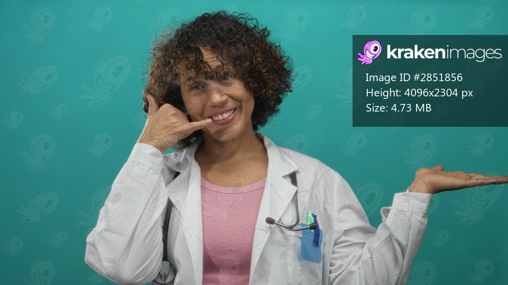 Woman doctor in white coat with stethoscope making phone hand gesture to ear in teal studio; playful care.