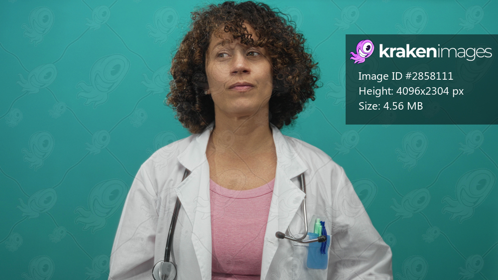 Woman doctor in white coat with stethoscope making phone hand gesture to ear in teal studio; playful care.